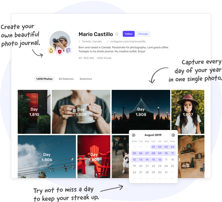 • Access to a global community of more than 10,000 people sharing the same goal - taking photos every day